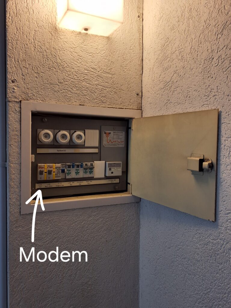 Jede Wohnung ist mit einem WLAN-Router ausgestattet. Diese sind über LAN-Kabel mit dem Glasfasermodem verbunden, welches sich im 2. OG befindet. Muss das Modem neu gestartet werden (in Abwesenheit dessen Benutzer), kann im Treppenhaus die Sicherung (Fxx) unterbrochen werden.