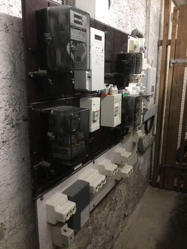 Die Zähler und die Hauptsicherungen zu den Wohnungen und zum Allgemeinstrom befinden sich auf der Hautptverteilung im Keller.